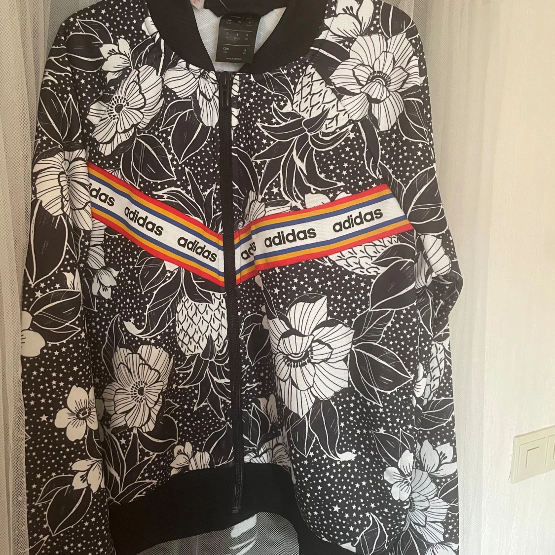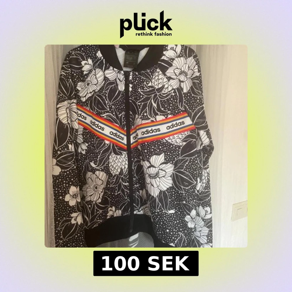 Säljer en snygg svartvit blommig jacka från Adidas med färgglada ränder och logotyp på framsidan. Storlek 164 (13-14år) men passar lika väl xs/ s. Sparsamt använd så i mycket fint skick!