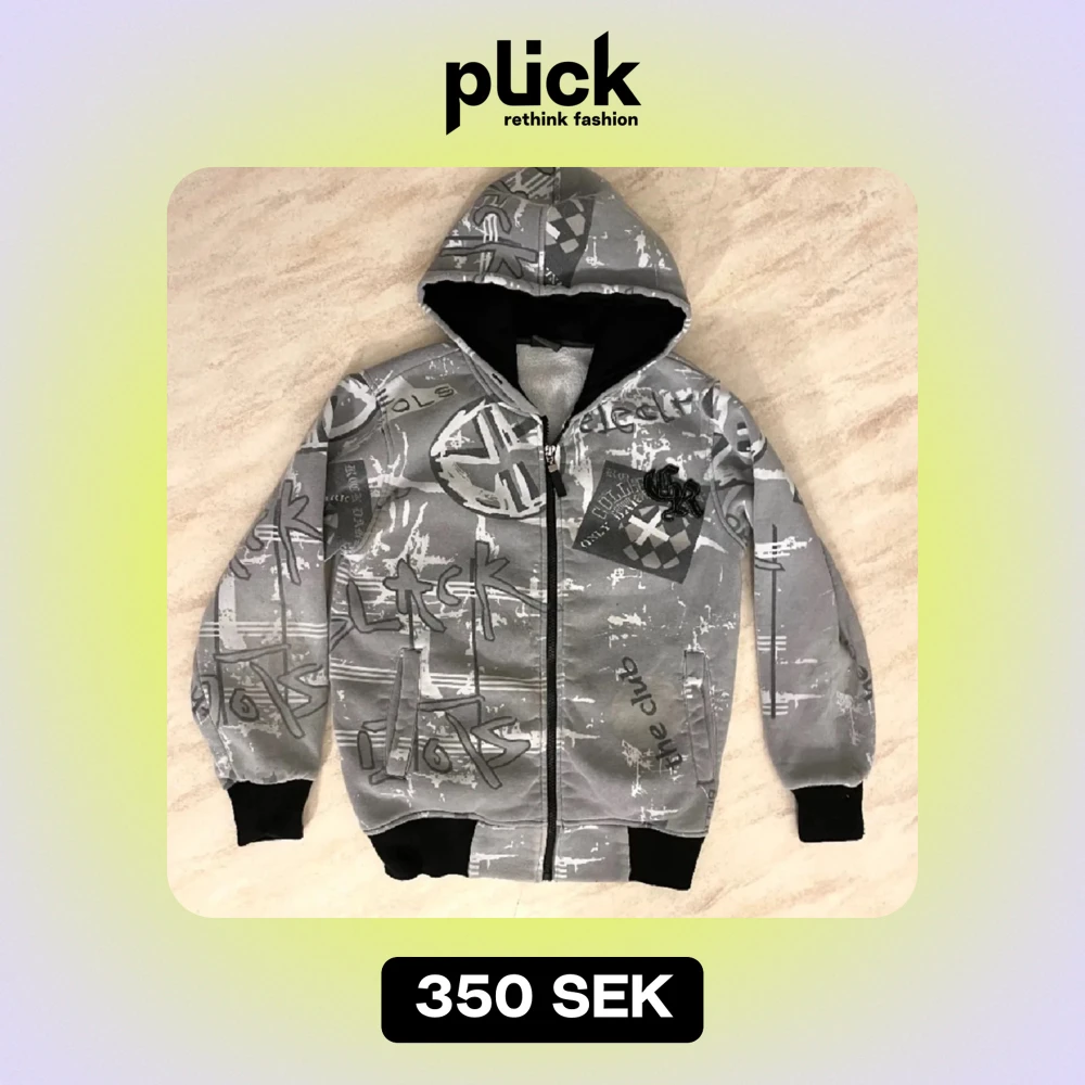 Säljer en grå hoodie med coolt grafiskt mönster och textdetaljer. Den har en dragkedja framtill och en skön huva. Rätt så grisch soho om du frågar mig iaf