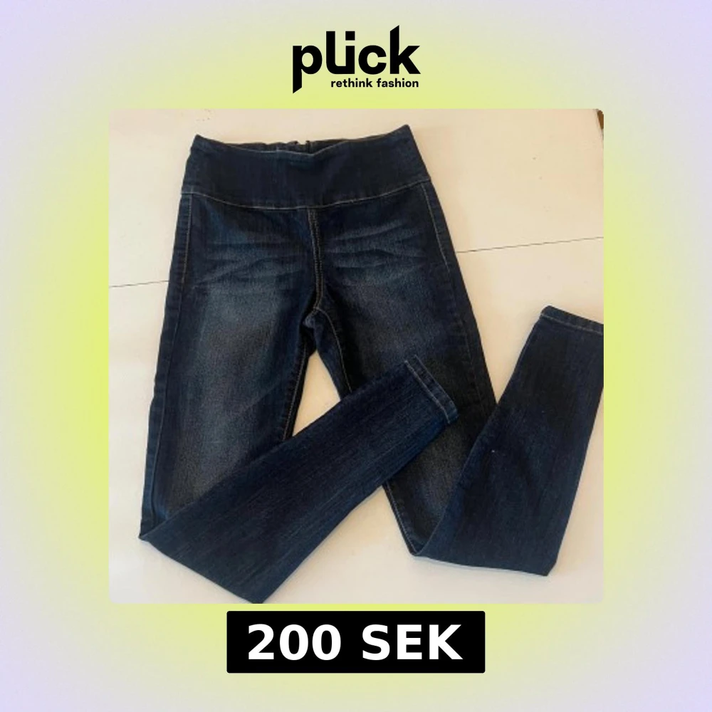 Mörkblå jeans med hög midja och dragkedja bak. Tight passform med klassiska bakfickor och lätt slitna detaljer framtill. Perfekta för dig som gillar en smal siluett och stretchigt material. Vet inte vilken storlek det är men ca stl 36.