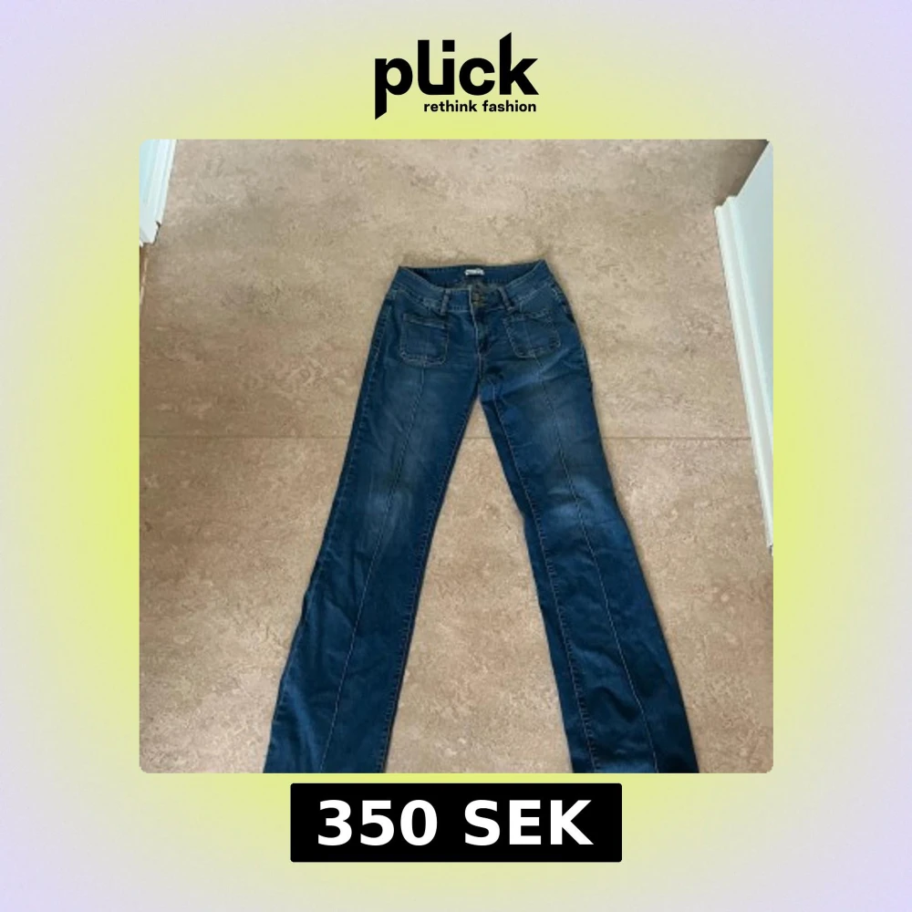 Snygga blå jeans från madlady med bootcut,lowwaist-modell och markerade sömmar längs benen. Jeansen har stora framfickor och bakfickor med lock och knapp. perfekt för dig som gillar retrovibbar. Eu 38 tall clarie blue. Original pris 700kr.
