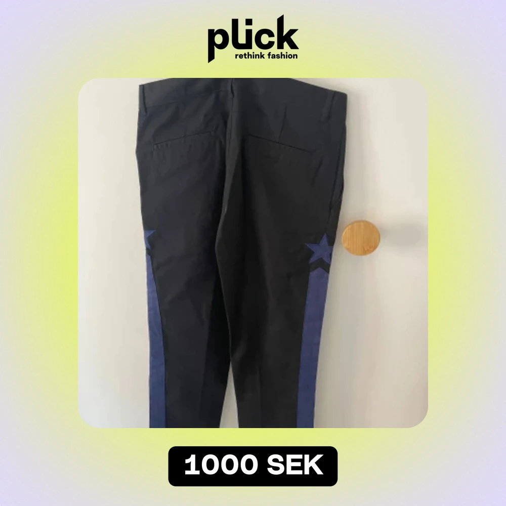 Säljer ett par svarta byxor med coola blå stjärndetaljer på sidorna. Byxorna har en knapp och dragkedja framtill samt två bakfickor. Perfekta för en unik och stilren look!
