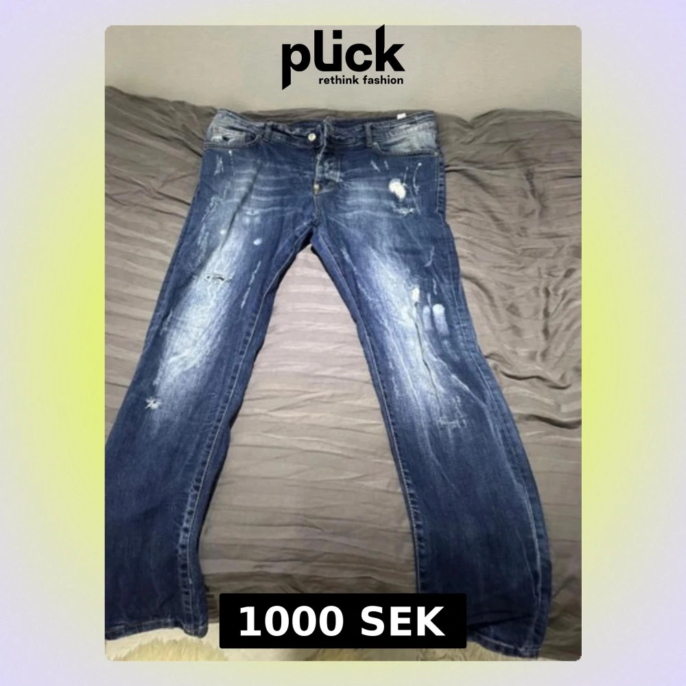 Säljer ett par blå Dsquared2 jeans med coola slitningar och vita färgstänk. Jeansen har klassisk femficksmodell, rak passform och en stor blå patch bak i midjan. Materialet är robust denim med snygg tvätt och detaljer som ger en unik look.