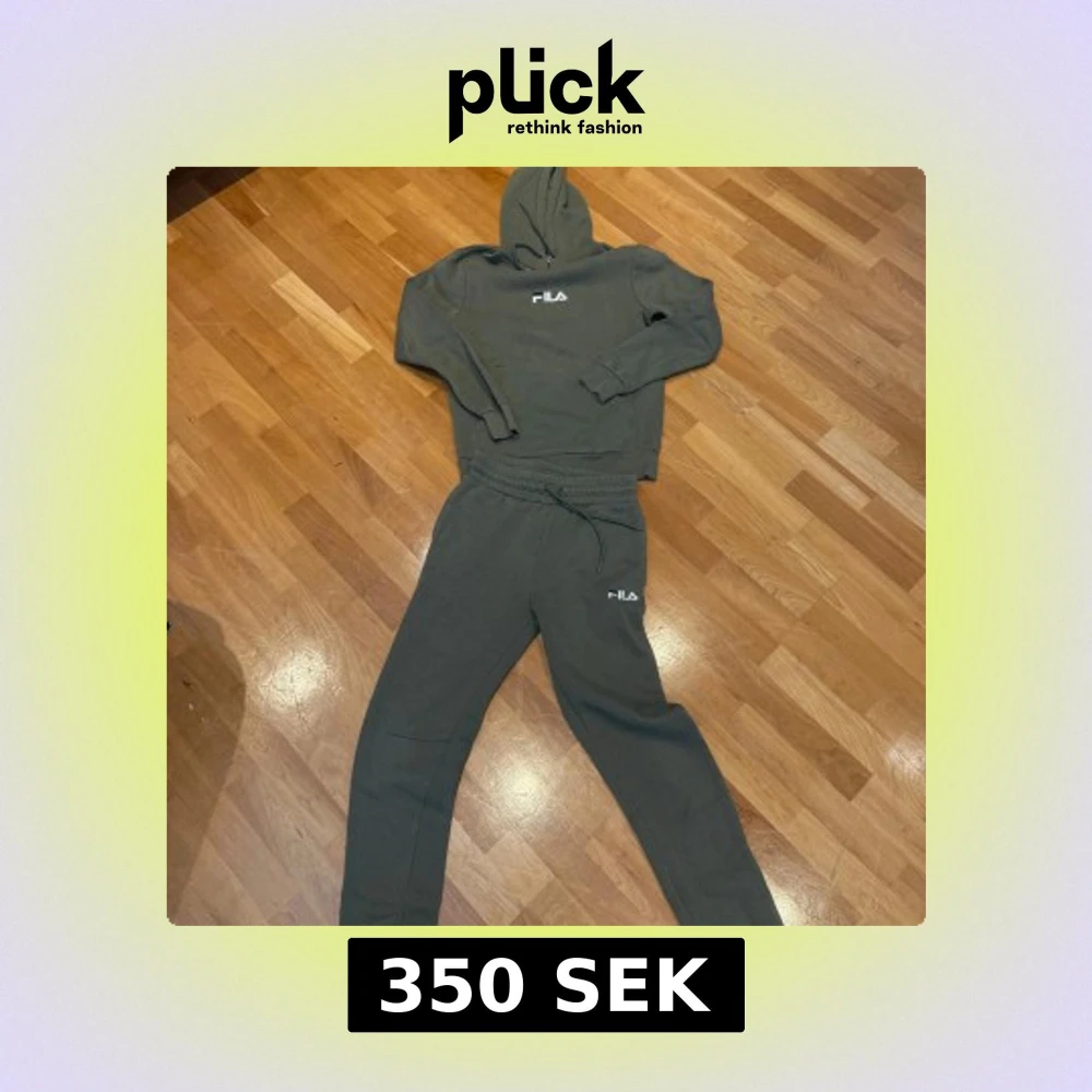 Mörkgröna mjukisbyxor och tröja från Fila med broderad vit logga på benet och vid bröstet. Byxorna har resår och snörning i midjan för skön passform. Perfekta för chill eller träning, tillverkade i mjukt bomullsmaterial.