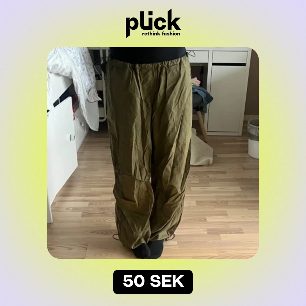 Parachute pants från pull and bear!! 💚 säljer pga jag inte använder längre. Byxorna är skrynkliga då jag inte har strykt dem, men annars inga andra stora defekter!! Fickor på sidan och där bak! Justerbara i midjan och vid anklarna💚🤎 strl M