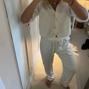 Vita satin byxor från Djerf Avenue. Använda fåtal gånger. Storlek M men passar S bättre. Nypris 1 600 kr ca.