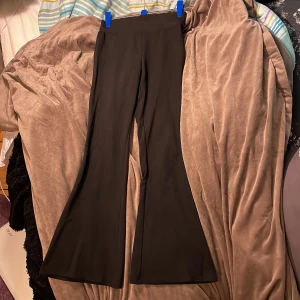 Svarta bootcut  - Säljer ett par svarta bootcut byxor med låg midja. Byxorna har en snygg utsvängd passform och sitter tajt upptill. Perfekta för dig som gillar en stilren och trendig look. Materialet är mjukt och stretchigt för extra komfort. Nytt skick