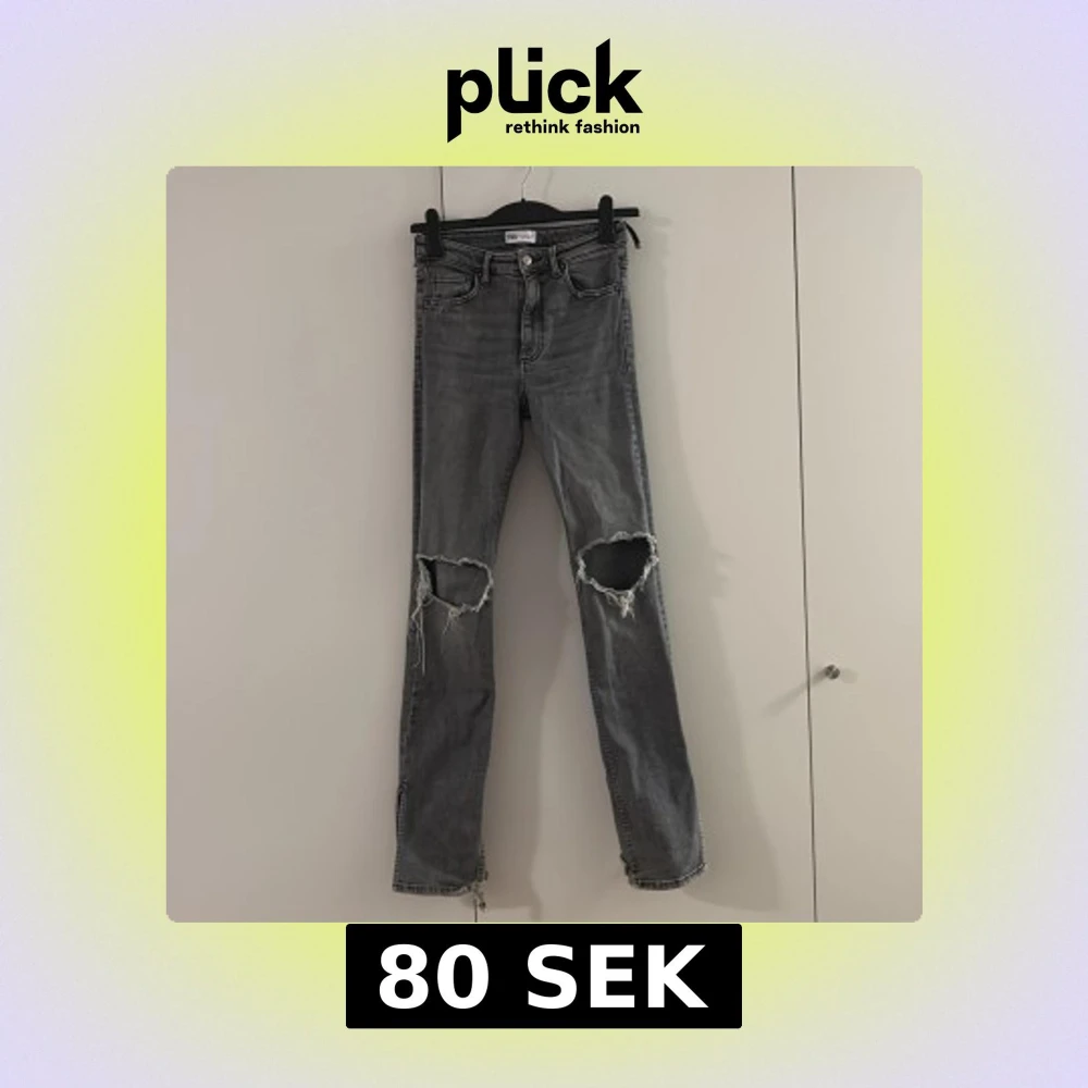 Säljer ett par grå jeans från Zara med snygga slitningar över knäna och slits vid bensluten. Modellen är rak och har klassisk femficksdesign. Jeansen har hög midja och är tillverkade i jeansmaterial med en cool, tvättad look.