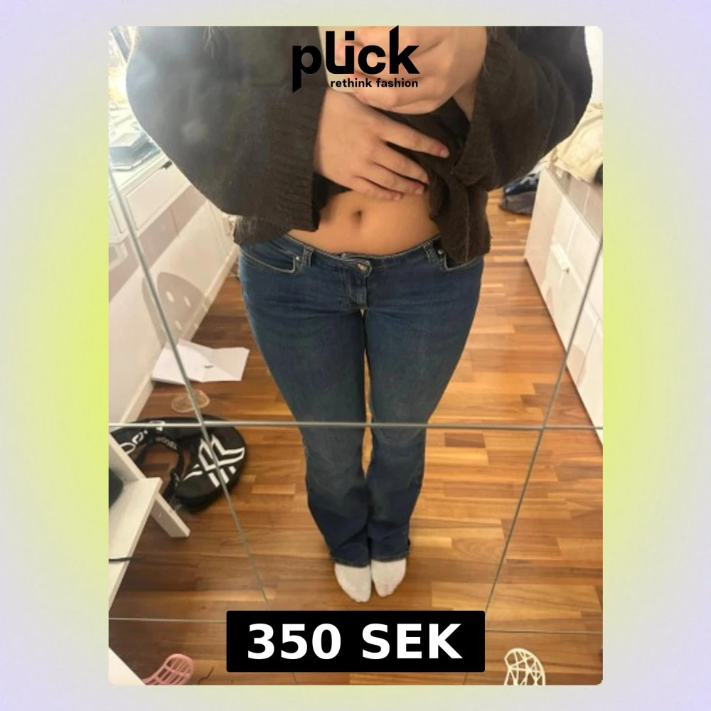 Säljer ett par klassiska blå bootcut jeans med låg midja från only. Jeansen har fem fickor, knappgylf och en snygg tvättad finish. Perfekta för dig som vill ha ett par jeans som sitter skönt på höften.