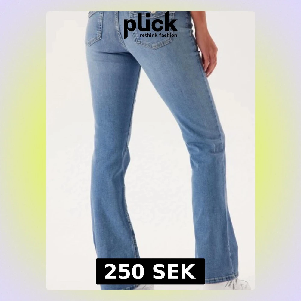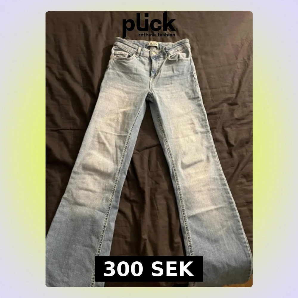 Säljer ett par ljusblå bootcut jeans från ONLY med klassisk femficksdesign och snygga bakfickor med lock och knapp. Jeansen har normal passform och är tillverkade i bomull med en skön stretch. Supersköna jeans!