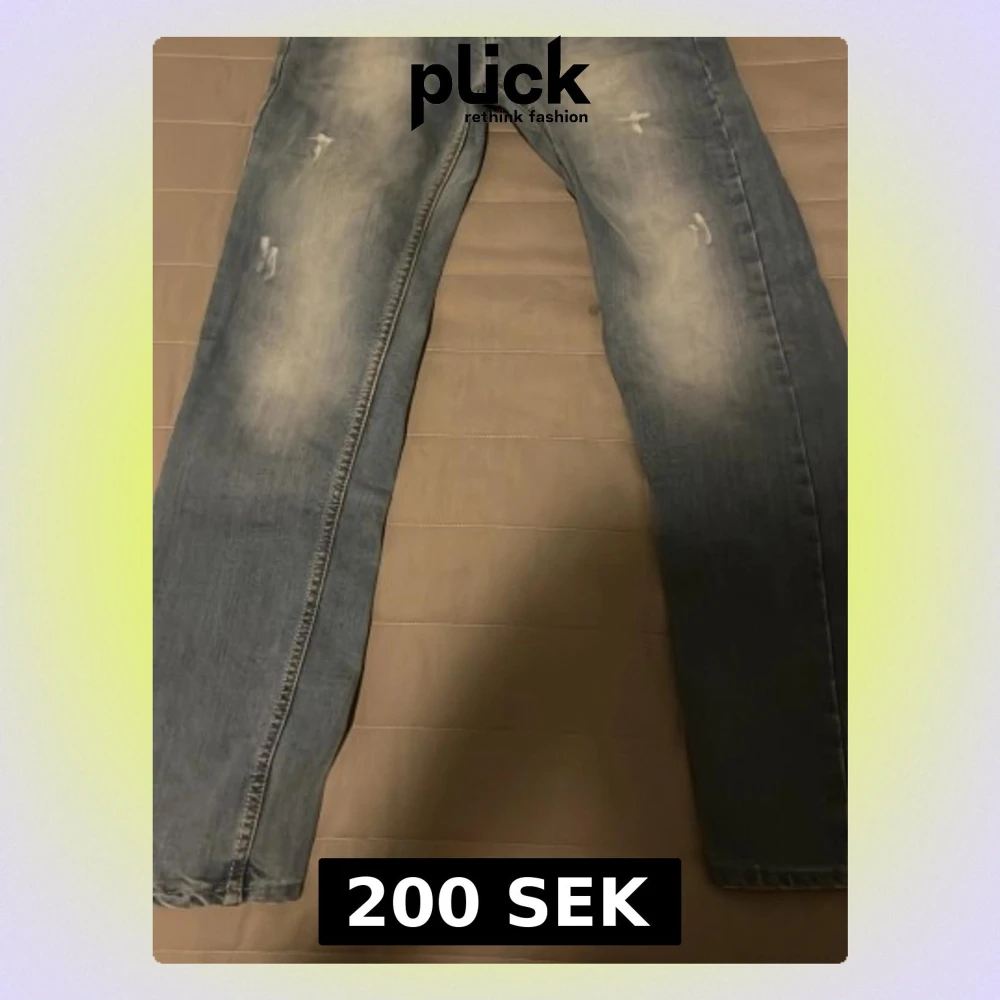Säljer ett par ljusblå jeans med slitningar och tvättade detaljer på låren och knäna. Jeansen har raka ben och klassiska bakfickor med dekorativa sömmar. Perfekta för en avslappnad och trendig look.