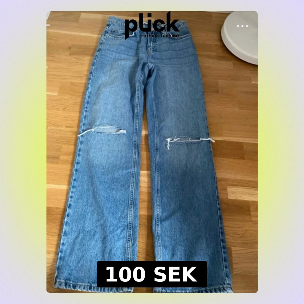 Säljer ett par blå raka jeans i klassisk denim med slitna detaljer över båda knäna. Jeansen har hög midja, fem fickor och stängs med dragkedja och knapp. Perfekta för en avslappnad och trendig look.