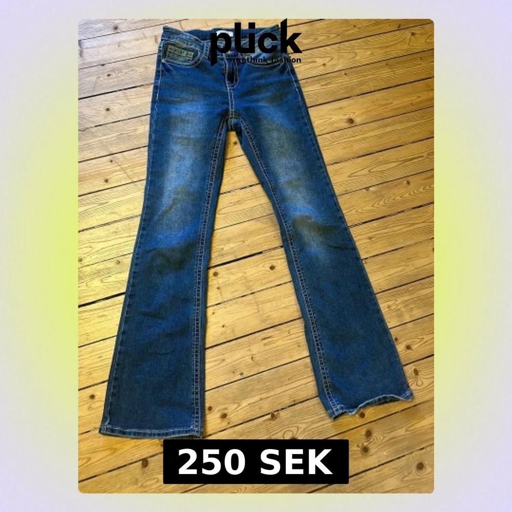 Snygga blå bootcut jeans med lätt slitna detaljer och klassisk femficksdesign. Jeansen har utsvängda ben, perfekt för en avslappnad och trendig look. Materialet är klassisk denim i bomull.