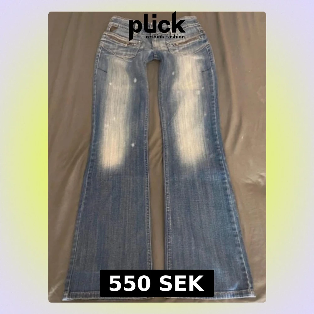Snygga blå bootcut jeans med slitningar och ljusa partier framtill och baktill. Jeansen har låg midja, dragkedjor på fickorna fram och klassiska bakfickor. Tillverkade i denim med en cool tvättad look som ger en avslappnad vibe. Ett hål bak finns.