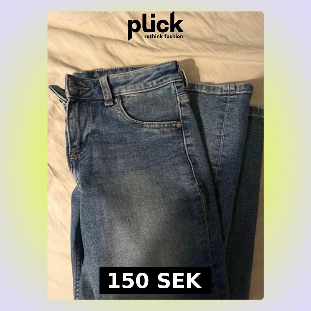 Säljer ett par klassiska blå jeans med utsvängd passform. Jeansen har låg midja och är i storlek 38. Perfekta till en avslappnad stil och tillverkade i mjuk denim.