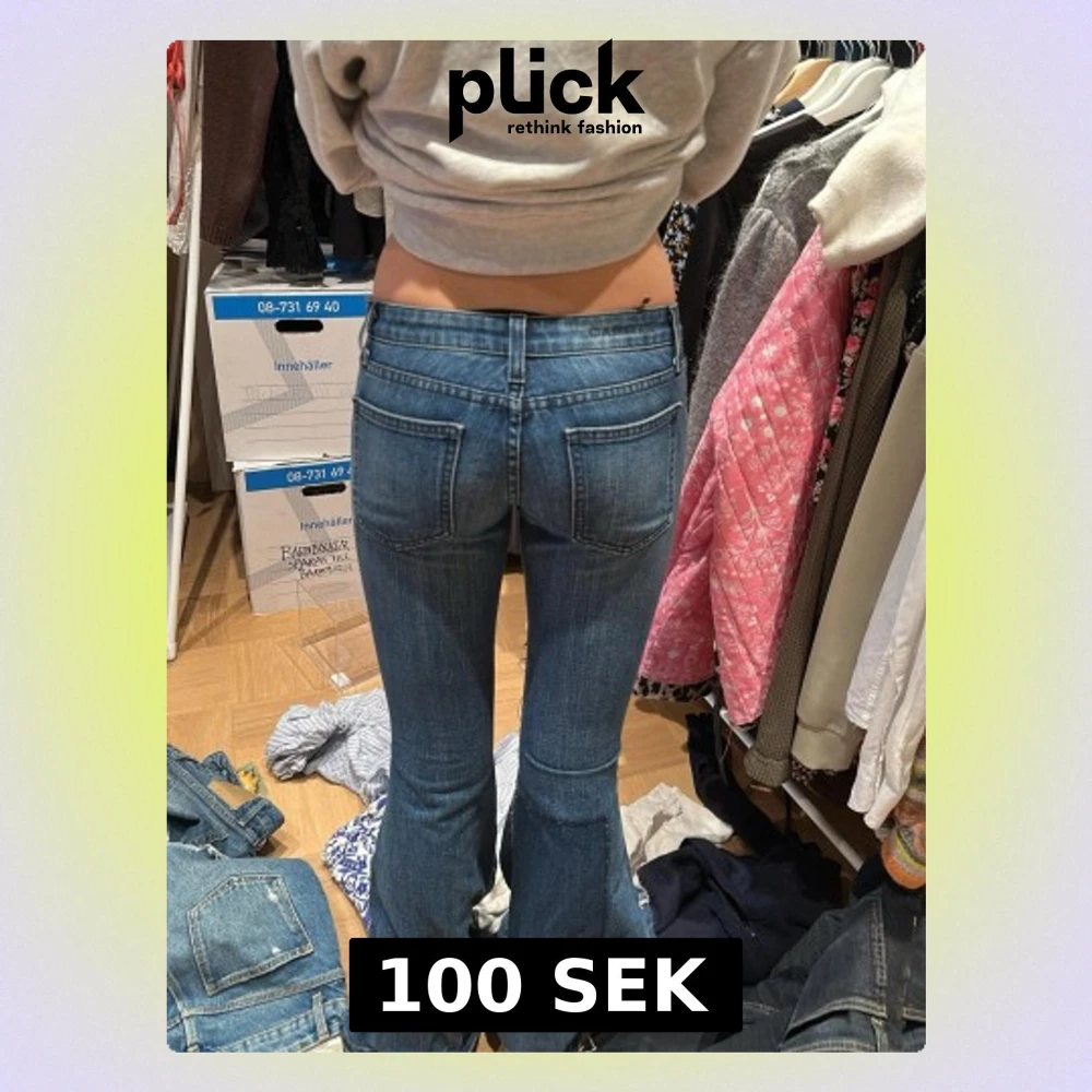 Säljer ett par blå bootcut jeans med markerade sömmar och stora bakfickor. Jeansen har en klassisk femficksmodell och är tillverkade i denim med lätt stretch. Perfekta för dig som gillar en retroinspirerad look med utsvängda ben.