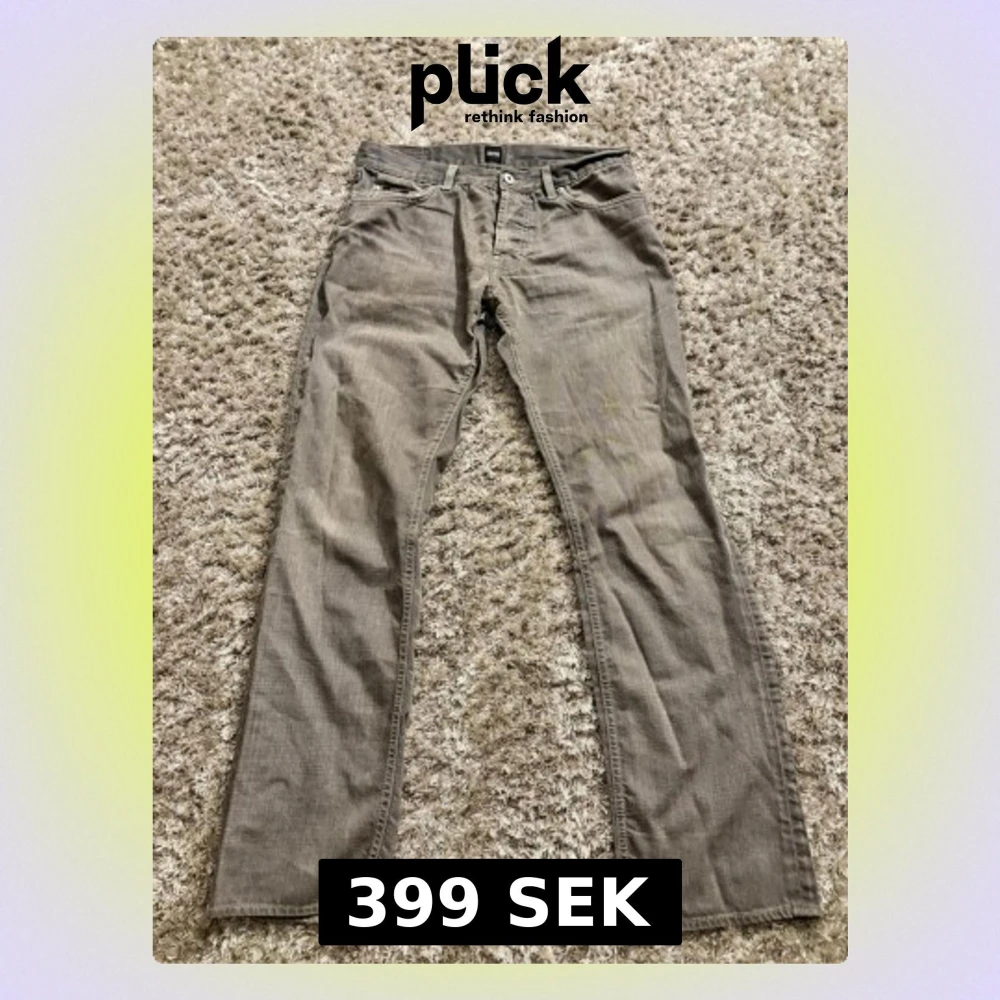 Säljer ett par grå jeans från BOSS Hugo Boss med klassisk femficksmodell och raka ben. Jeansen har silverfärgade nitar och bälteshällor. Materialet är denim i bomull med en snygg tvättad look. Jag har ärvt de från en vän och det står tyvärr ingen storlek men jag har testat de och jag skulle säga att de är i storleken 30/32, 30/33Perfekta för en avslappnad och stilren outfit och är riktigt sköna. Har du några frågor så är det bara att skriva🙌
