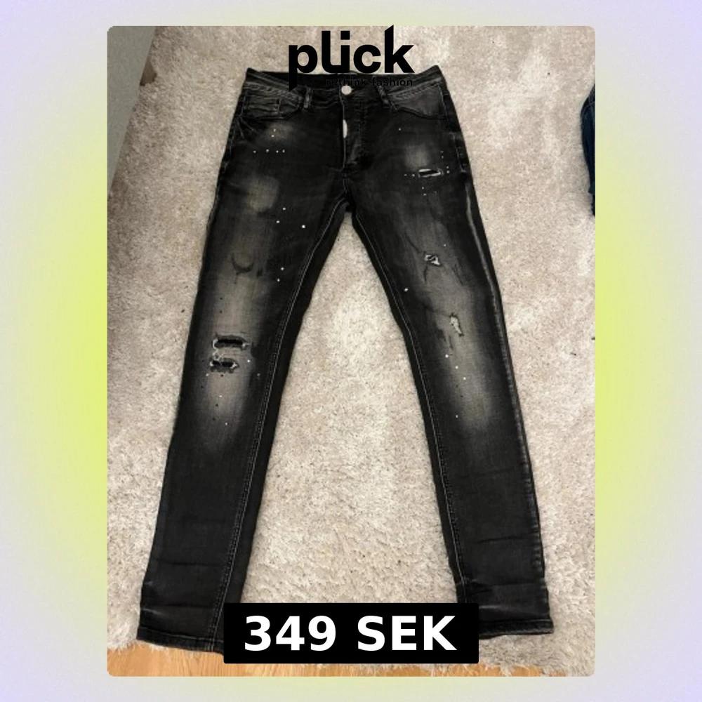 Säljer ett par svarta skinny jeans från Alessandro Zavetti med coola slitningar och blekta detaljer. Jeansen har vita färgstänk och klassisk femficksdesign. Perfekta för dig som gillar en edgy streetstil.