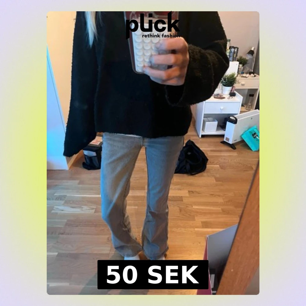Säljer ett par grå bootcut jeans med klassisk femficksdesign och normal midja. Jeansen har en avslappnad passform över låren och lätt utsvängda ben. 💛💛