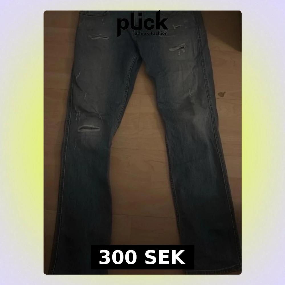 Säljer ett par blå jeans med raka ben och slitna detaljer på både lår och knän. Jeansen har klassisk femficksmodell och en tvättad look som ger en avslappnad vibe. Perfekta för dig som gillar en trendig och casual stil.