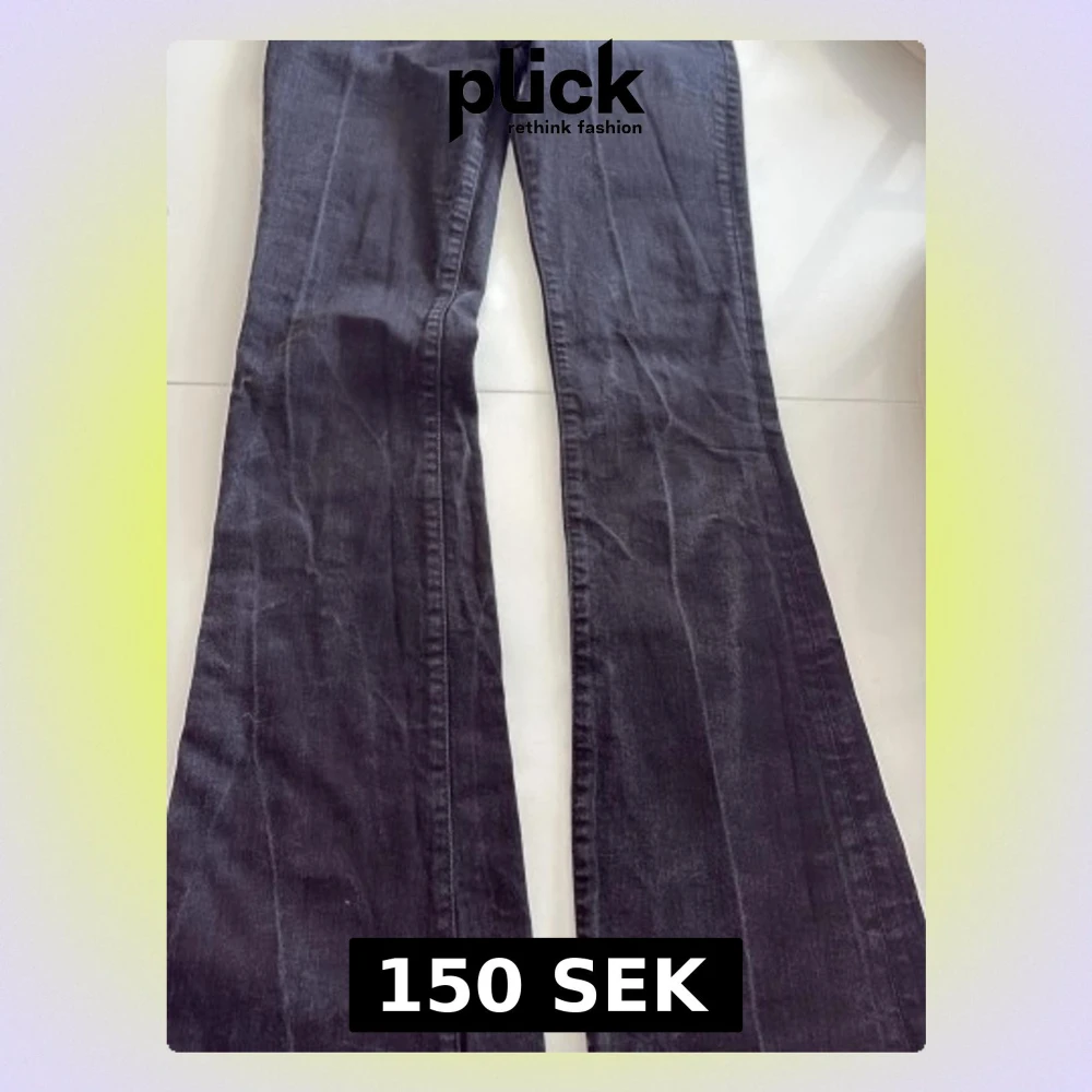 Säljer ett par svarta bootcut jeans med utsvängda ben och klassisk femficksdesign. Jeansen har en mörk tvätt och är tillverkade i ett mjukt denimtyg som ger en skön passform. Perfekta för dig som gillar retrostil och vill ha ett par jeans som sticker ut.