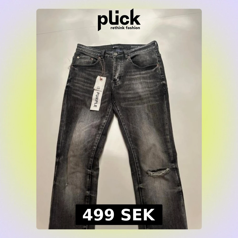 Säljer ett par svarta jeans från Purple med snyggt slitna detaljer och en trasig knädel. Jeansen har klassisk femficksdesign, raka ben och tvättad finish för en cool look. Perfekta för dig som gillar streetwear och vill ha en avslappnad stil.