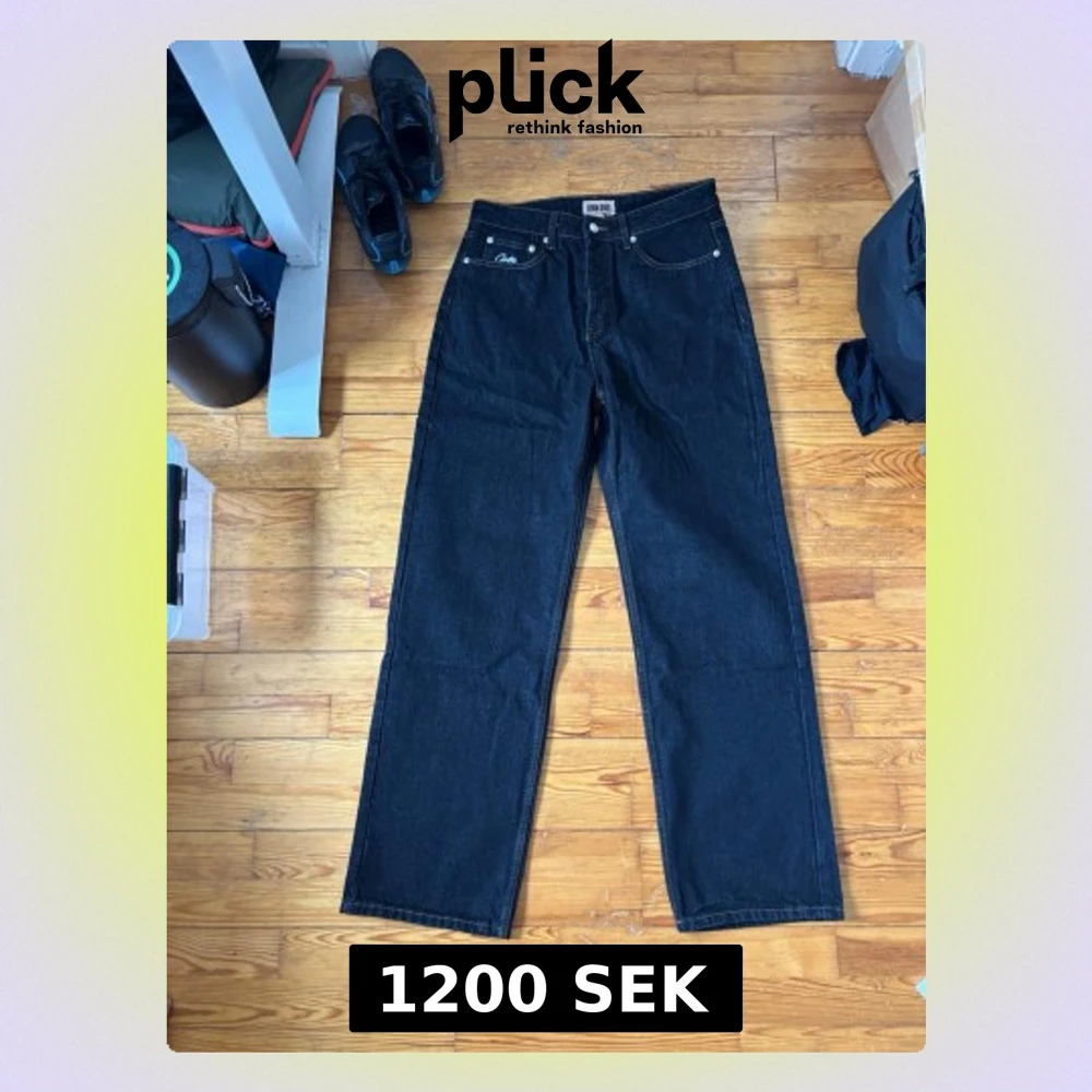 Säljer ett par svarta raka jeans från cortiez med klassisk femficksdesign. Jeansen har en cool detalj med röd, vit och grön rand samt Cortiez-logga på ena bakfickan. Tillverkade i slitstark denim, perfekta för en streetwear-look.
