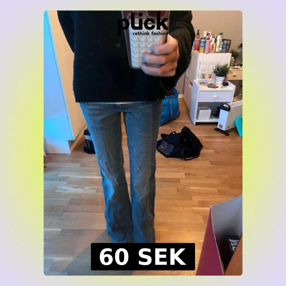 Säljer ett par klassiska blå bootcut jeans med låg midja och femficksmodell. Jeansen har en lätt tvättad look och raka ben som går ut lite nedtill. Perfekta för dig som gillar en avslappnad och trendig stil💕💕