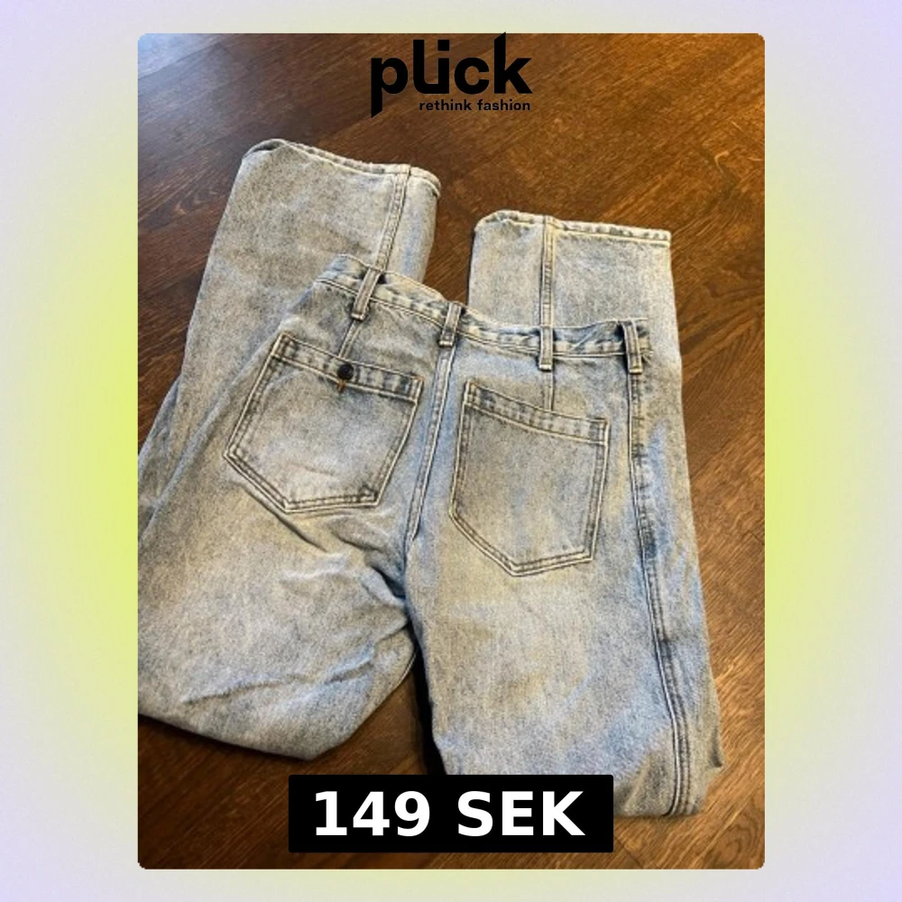 Säljer ett par ljusblå jeans med rak passform och klassisk femficksdesign. De är mid- high straight baggy. Den har inga lappar så vet inte märke och storlek men på bild 2 och 3 syns måtten.