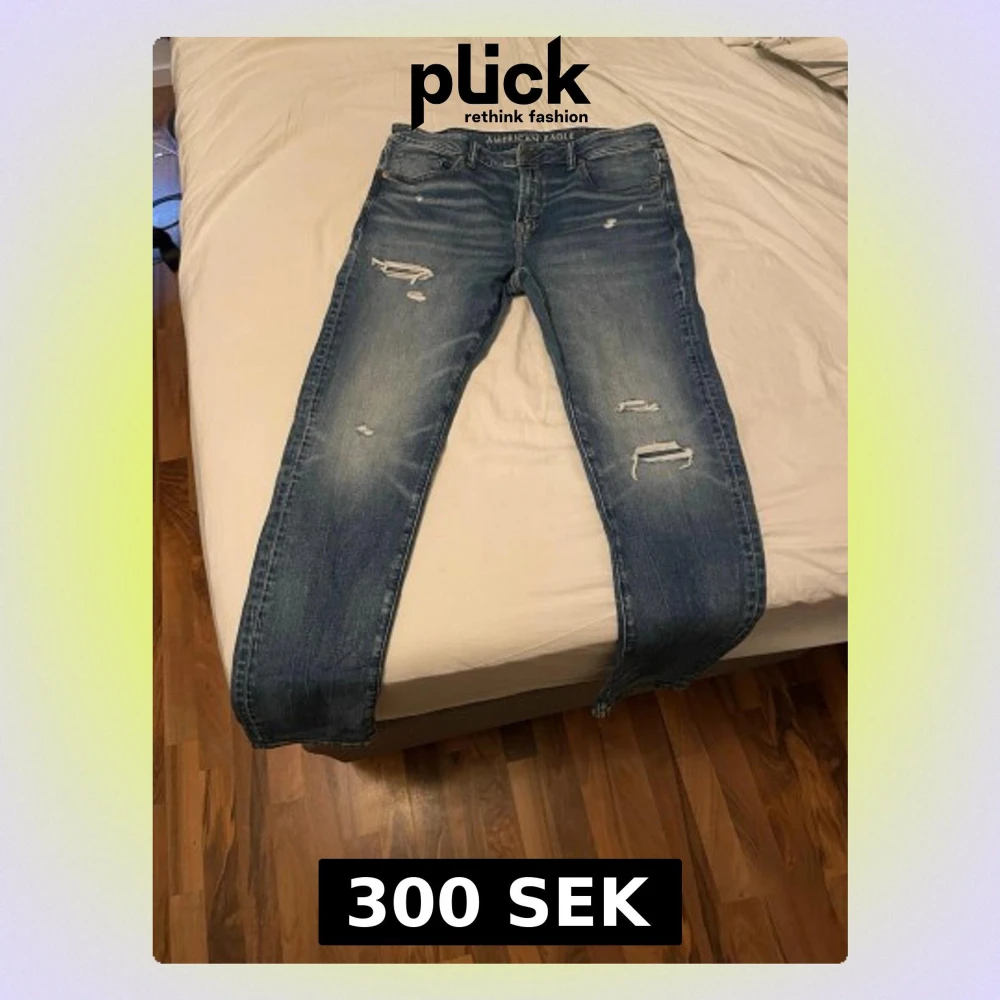 Säljer ett par blå jeans från American Eagle med slitningar och hål på framsidan för en trendig look. Jeansen har klassisk femficksmodell, normal midja och raka ben. Perfekta för dig som gillar en avslappnad och cool stil.