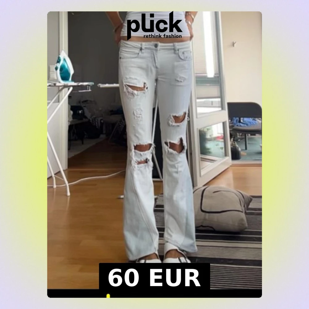 Säljer ett par otroligt snygga ljusblå bootcut jeans med stora slitningar och hål på både lår och knän.