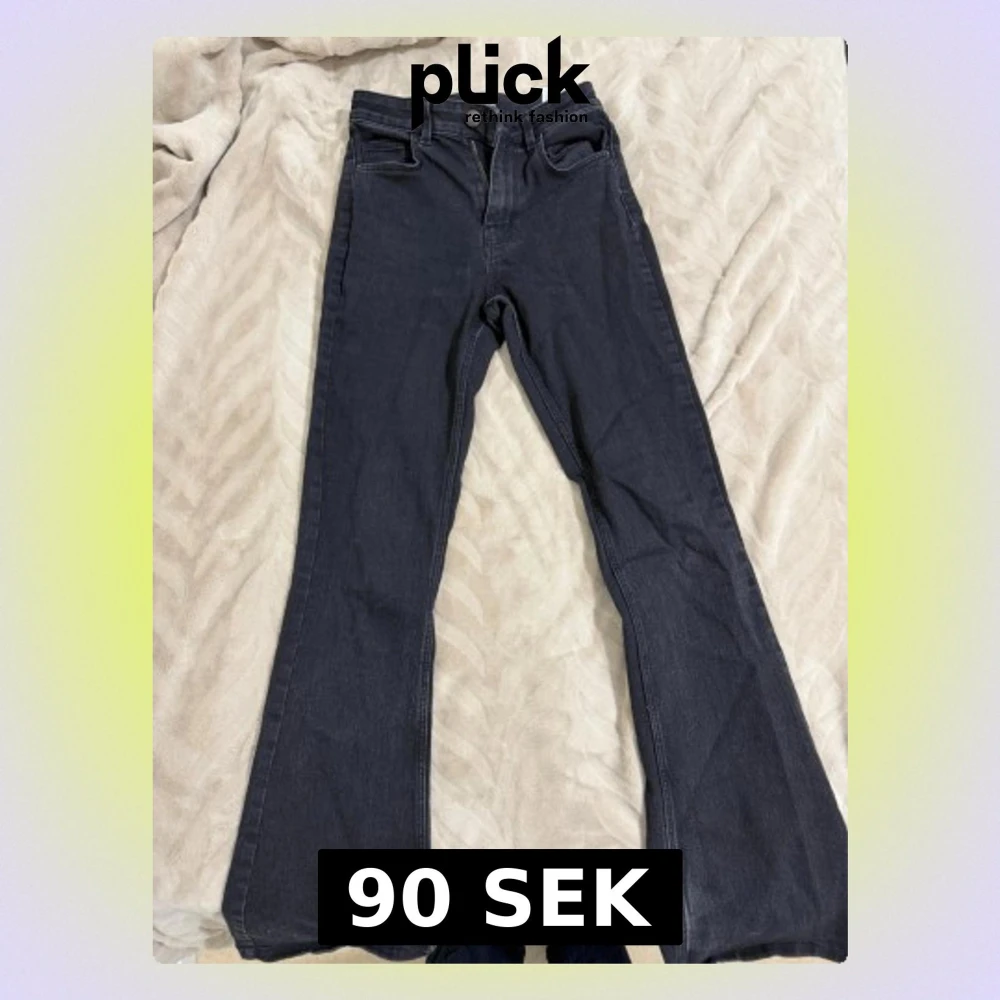 Säljer ett par svarta bootcut jeans med hög midja och klassisk femficksdesign. Jeansen har en tydlig slitning och trasig detalj vid ena benslutet för en edgy look. Materialet är denim med lätt stretch för skön passform.