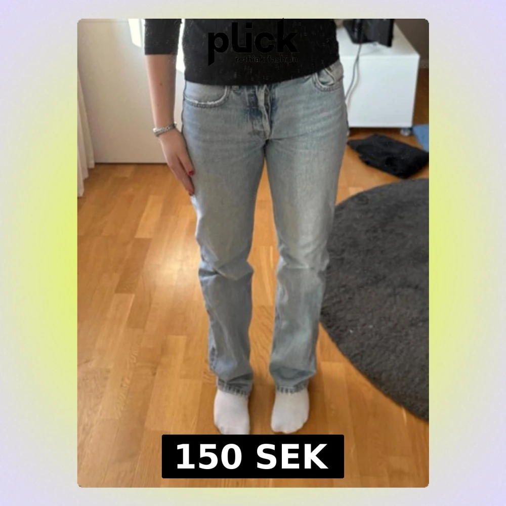 Säljer ett par ljusblå jeans med rak passform och knappar istället för dragkedja. Så snygga, men för små för mig.