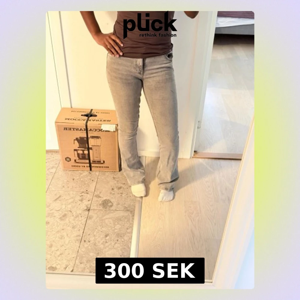 Säljer ett par ljusgrå bootcut jeans med klassisk femficksdesign och normal passform. Jeansen har en enkel look utan mönster eller slitningar och är perfekta för dig som gillar en clean stil. Passar till det mesta och är riktigt bekväma.