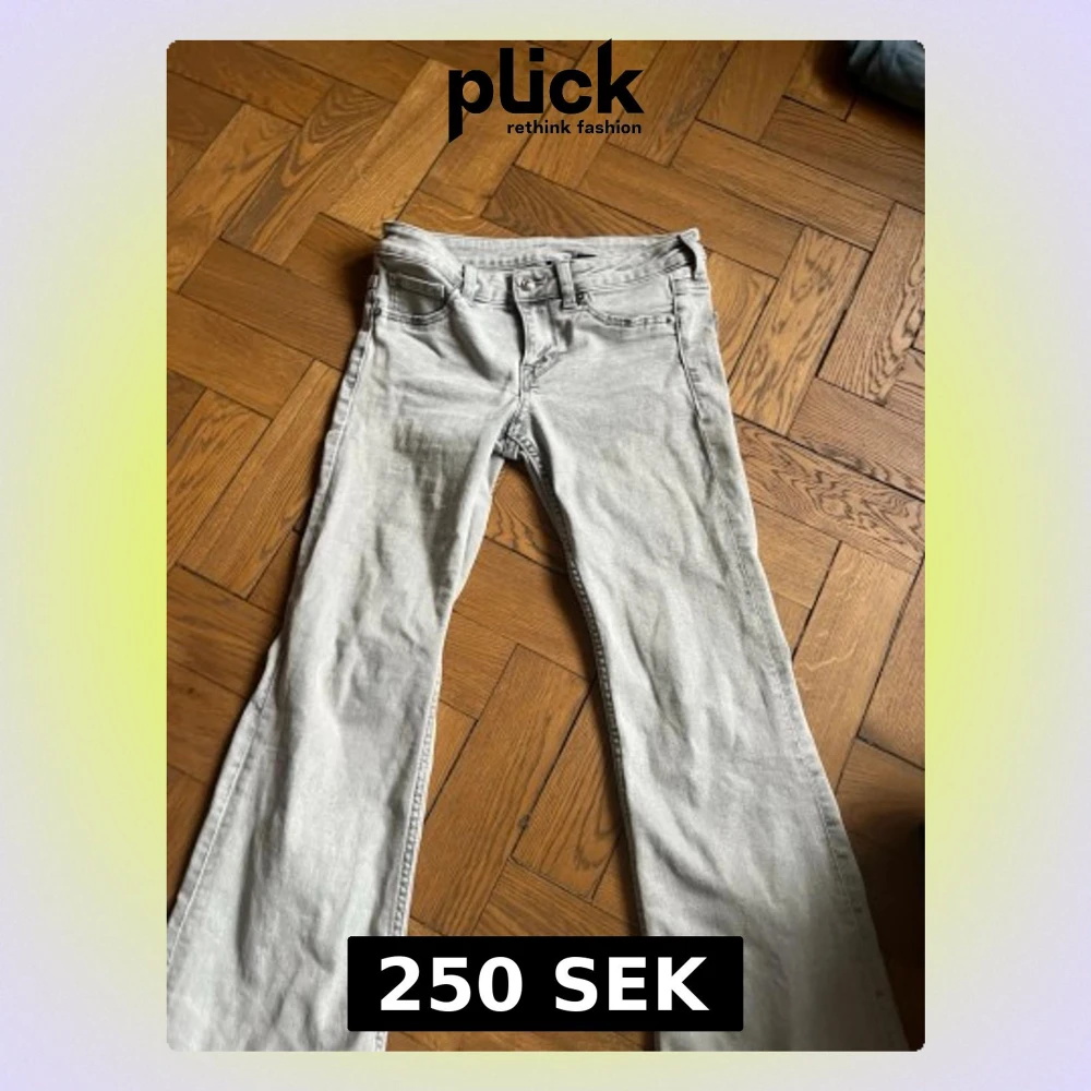 Säljer ett par ljusgrå low waist bootcut jeans med klassisk femficksdesign och låg midja. Jeansen har utsvängda ben och är tillverkade i denim med en mjuk känsla. Perfekta för dig som gillar en avslappnad och trendig look.