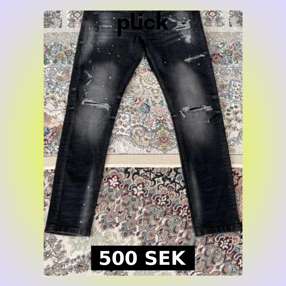 Säljer ett par svarta jeans från Supply & Demand med slitningar och distressed detaljer. Jeansen har skinny fit, coola rivna partier och små vita stänk för en trendig look. Perfekta för dig som gillar streetstyle och vill sticka ut.