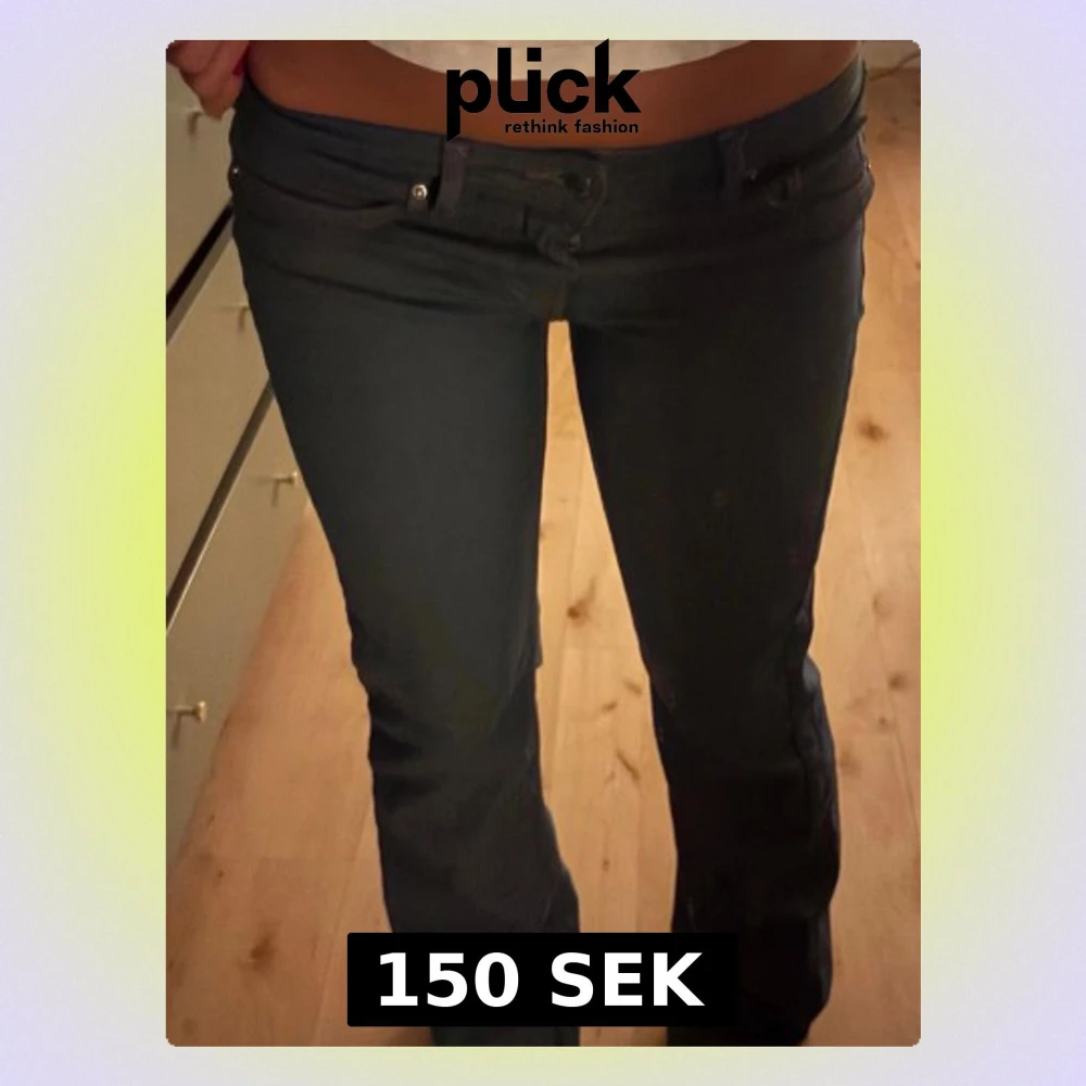 Säljer ett par mörkblå bootcut jeans med låg midja. Jeansen har en snygg passform som sitter tajt över låren och släpper ut vid vaden.