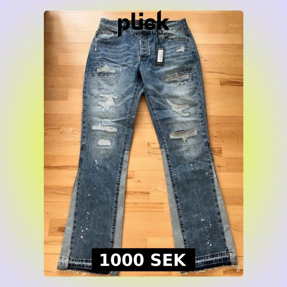 Säljer ett par blå jeans från Lorenzo Veratti med slitna detaljer, hål och färgstänk för en riktigt edgy look. Raka ben och råa kanter nertill ger en avslappnad vibe. Perfekta för dig som gillar streetstyle och vill sticka ut. Jag säljer dessa jeans eftersom att jag köpte fel storlek
