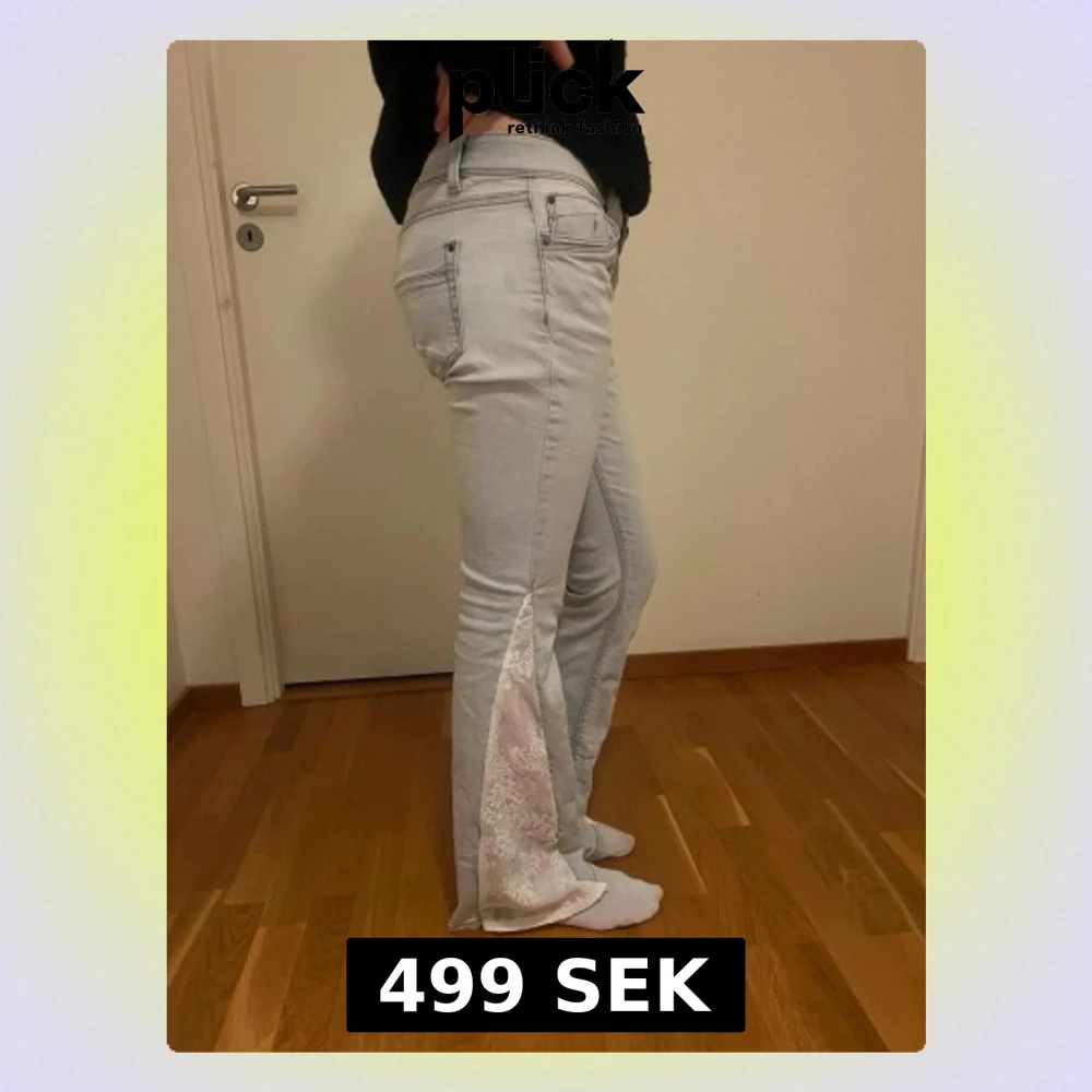 Unika ljusblå jeans med breda spetsinsatser längs bensluten. Jeansen har normal passform och klassisk femficksdesign. Spetsen ger en cool och personlig touch till looken. Perfekta för dig som vill sticka ut lite extra! Midjemåttet är 40 och innerbenslängden 79, storlek 36🩷