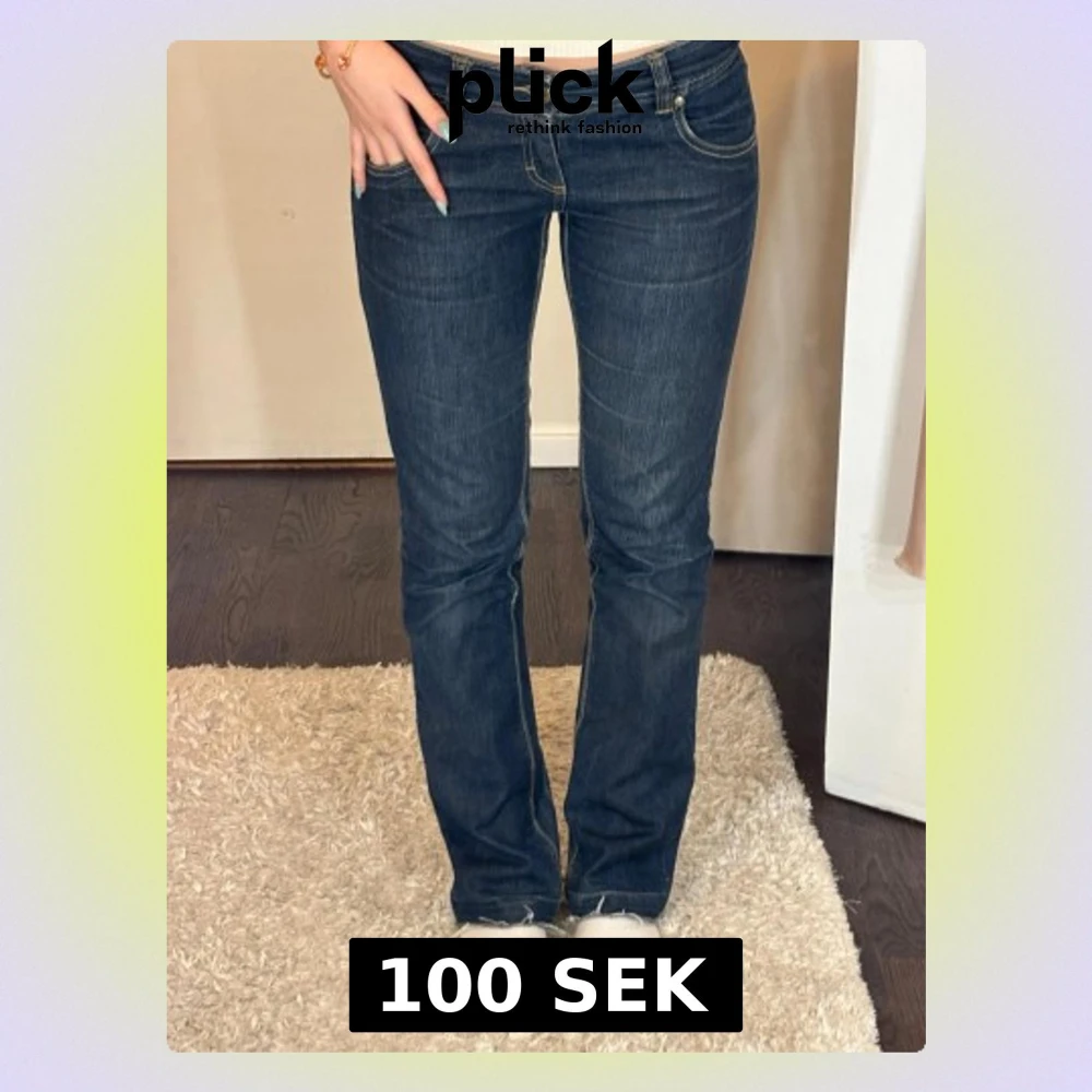 Snygga mörkblå bootcut jeans med kontrastsömmar. Jeansen har låg midja och lätt utsvängda ben. De är perfekta i längden på mig som är 168.