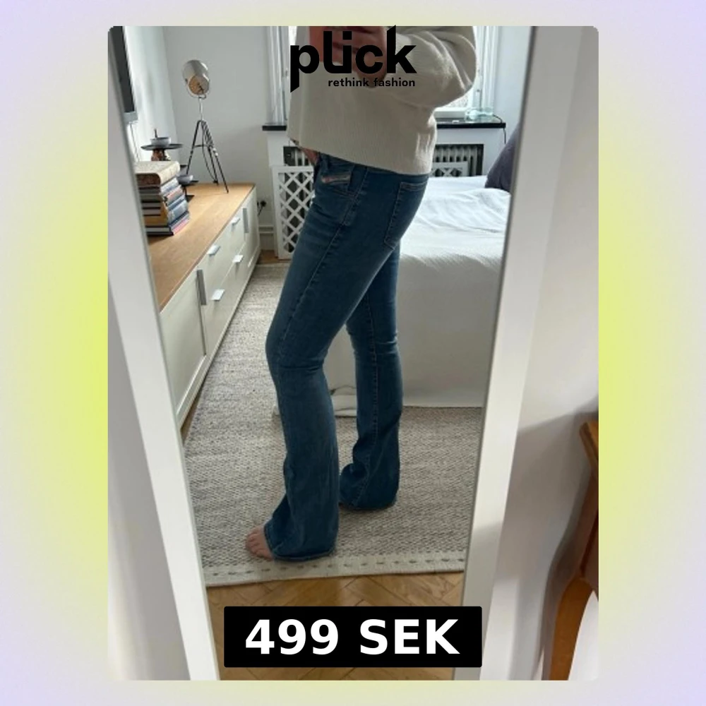 Säljer ett par klassiska blå bootcut jeans med låg midja och lätt slitning. Jeansen har fem fickor och stängs med knapp och dragkedja. Perfekta för dig som gillar en avslappnad men ändå trendig look. Diesel, ca 38❤️