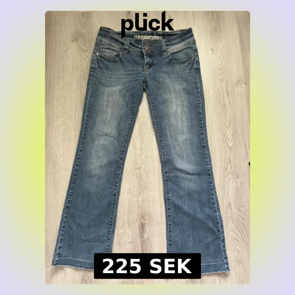 Säljer ett par blå bootcut jeans med snygga slitningar, super fina men används tyvärr inte