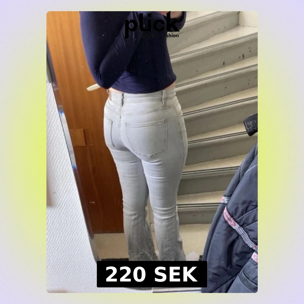 Säljer ett par ljusgrå bootcut jeans med hög midja och klassiska fem fickor. Jeansen har en snygg, smal passform upptill och lätt utsvängda ben. Perfekta för dig som vill ha en clean och stilren look.