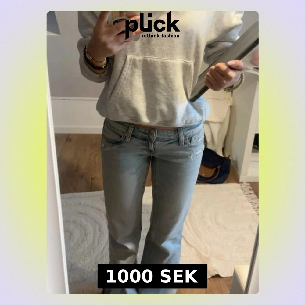 Säljer ett par ljusblå bootcut jeans med låg midja och diskreta slitningar framtill. Jeansen har klassisk femficksdesign och dragkedjegylf. Perfekta för en avslappnad och trendig look.