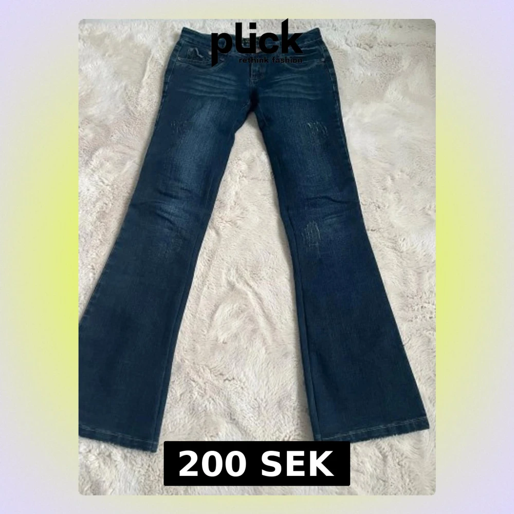 Säljer ett par mörkblå bootcut jeans med slitningar och snygga detaljer på bakfickorna. Jeansen har nitar och broderier på fickorna bak samt klassisk femficksmodell. Materialet är denim i bomull med lite stretch för skön passform. 2 defekter se sista bilderna