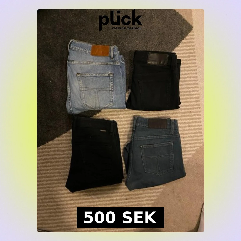 Säljer fyra par jeans i olika färger: ett par ljusblå, två par svarta och ett par mörkblå. Klassisk femficksmodell med raka ben och läderpatch bak i midjan. Perfekta för dig som vill ha flera stilar att välja mellan.