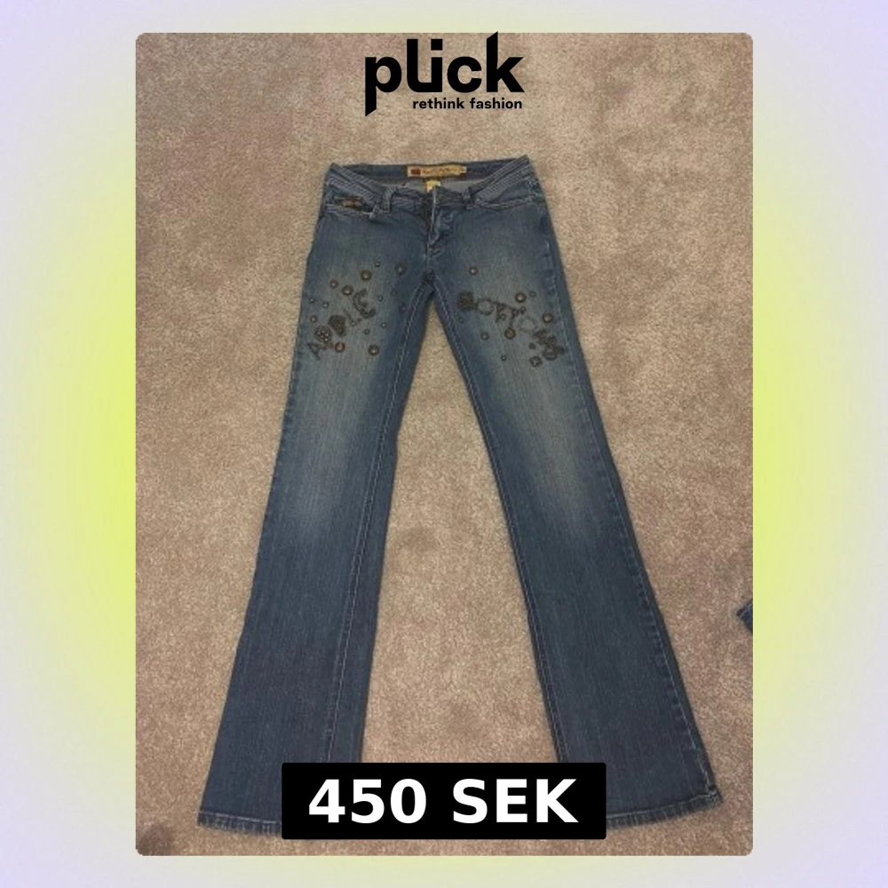 Säljer ett par blå bootcut jeans från Apple Bottoms med coola nitar och dekorationer på framsidan. Jeansen har klassisk femficksmodell, dragkedja och knapp, samt detaljerad etikett i midjan. Materialet är 98% bomull och 2% spandex för skön stretch. OPS- dom saknar en knapp, det hade kostat 100kr att fixa det så jag säljer dom för 450kr istället för 550kr