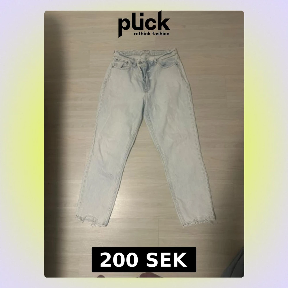 Säljer ett par ljusblå mom jeans med hög midja och raka ben. Jeansen har råa, fransiga kanter vid bensluten och klassisk femficksdesign. Perfekta för en avslappnad och trendig look. Finns en svag fläck på vänster knä. Stl 29/32