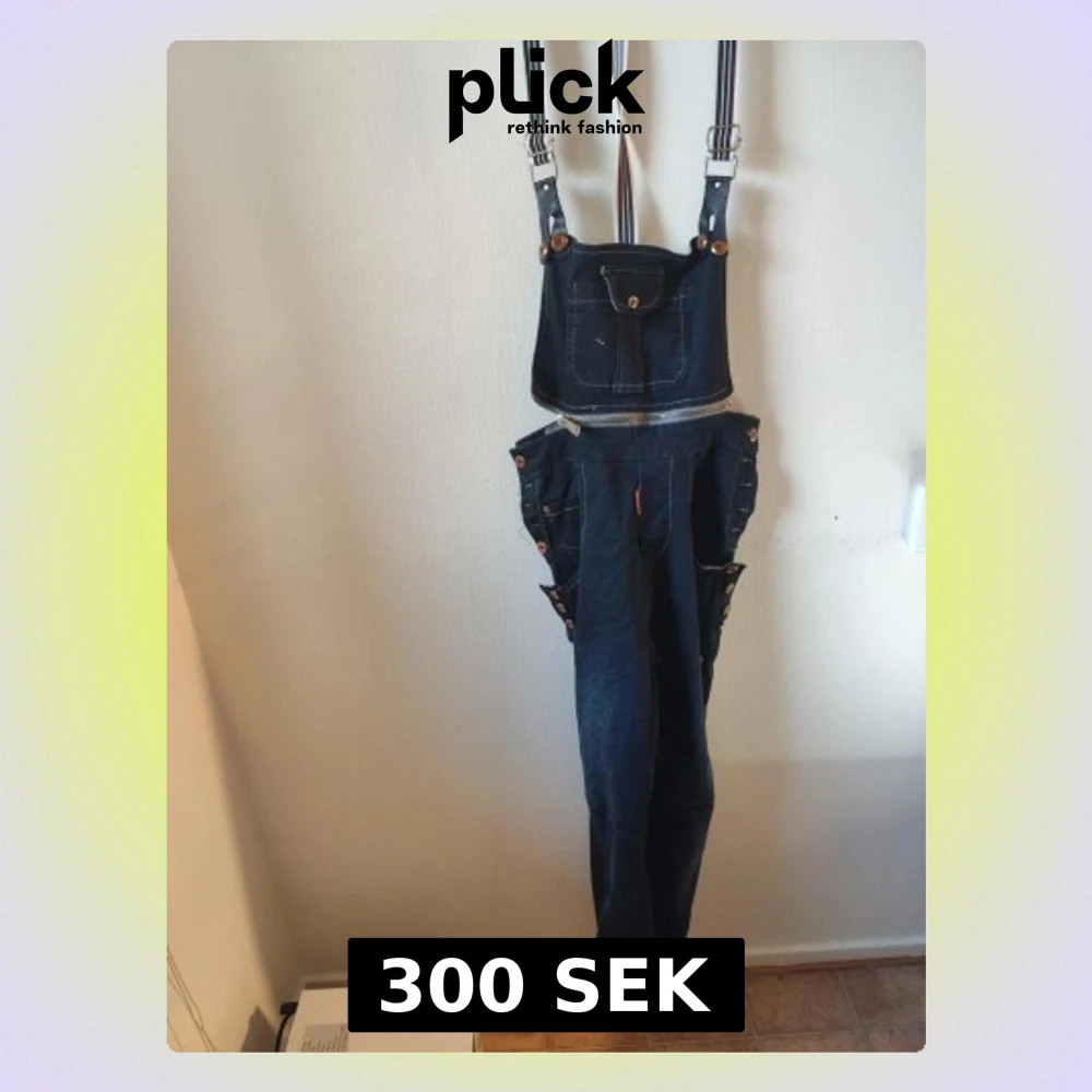 Unika mörkblå hängseljeans med bred frontficka, dekorativa knappar på sidorna och justerbara randiga hängslen. Jeansen har dragkedja i midjan och flera fickor. Perfekt för dig som vill sticka ut med en cool och retro look. Du är varmt välkommen att kika på mina andra annonser.