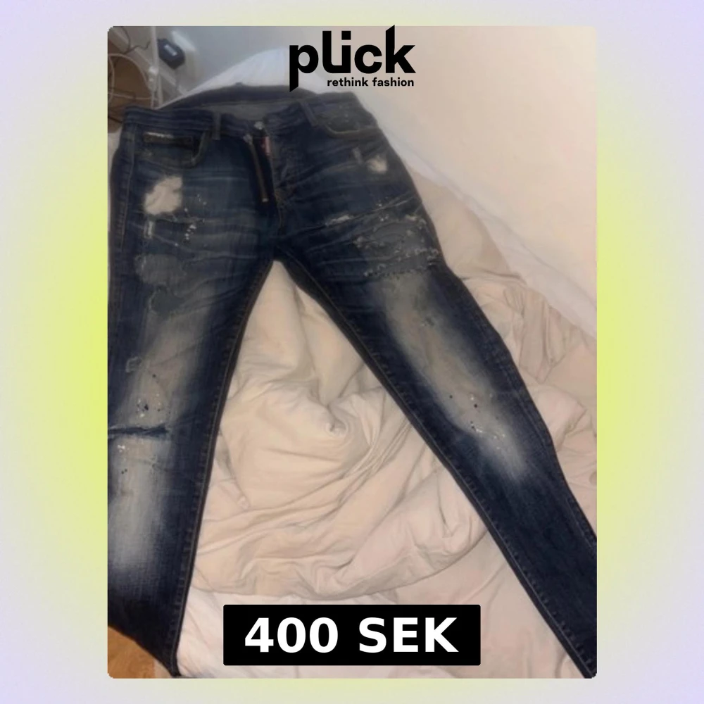 Säljer ett par mörkblå jeans med slitningar och färgstänk för en cool, trendig look. Jeansen har normal passform och klassisk femficksdesign. Perfekta för dig som gillar streetstyle och vill sticka ut lite extra.