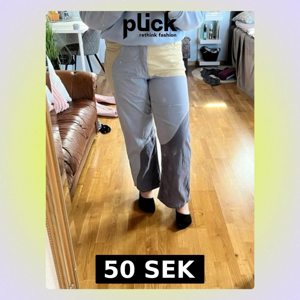 Unika patchwork jeans med beige och olika nyanser av grått. Vida ben och hög midja ger en avslappnad vibe. Snygga kontrastsömmar och flera fickor framtill. Perfekta för dig som vill sticka ut med en cool och trendig look.